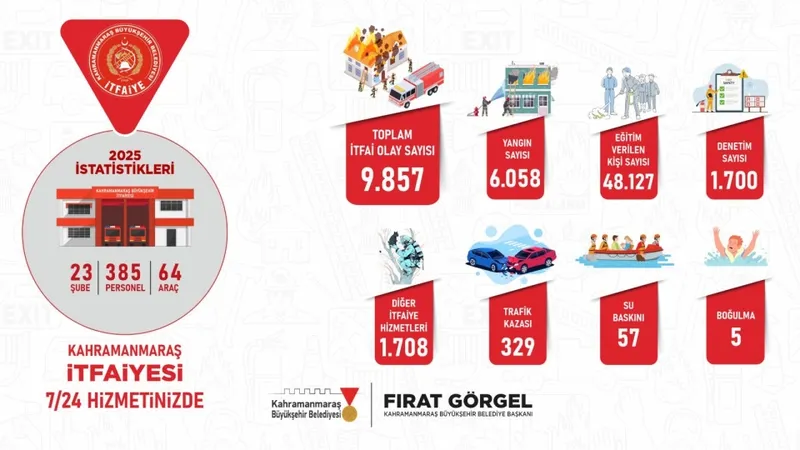Kahramanmaraş Büyükşehir Belediyesi İtfaiyesi, 2025 yılı boyunca vatandaşların güvenliği için özverili bir mücadele ortaya koydu. Hızlı refleksleri ve etkin müdahaleleriyle dikkat çeken ekipler, yangınlardan trafik kazalarına, su baskınlarından boğulma vakalarına kadar pek çok olayda profesyonel kadrosu ve modern donanımıyla can ve mal kaybını en aza indirmeyi başardı.