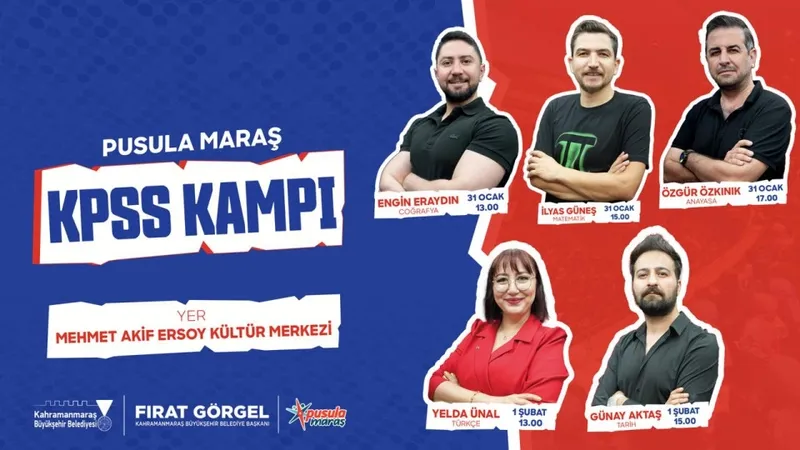 Kamu personeli olma hedefiyle KPSS’ye hazırlanan gençler için ise 31 Ocak ve 1 Şubat tarihlerinde özel bir kamp programı düzenlenecek. Yine Mehmet Akif Ersoy Kültür Merkezi’nde gerçekleştirilecek KPSS Kampında; Engin Eraydın, İlyas Güneş, Özgür Özkınık, Yelda Ünal ve Günay Aktaş katılımcılarla buluşacak. KPSS Kampı kapsamında uzman isimler tarafından coğrafya, matematik, anayasa, Türkçe ve tarih branşlarında detaylı anlatımlar yapılacak; sınavda sıkça çıkan konular, püf noktalar ve zaman yönetimi gibi başlıklarda gençlere rehberlik edilecek.