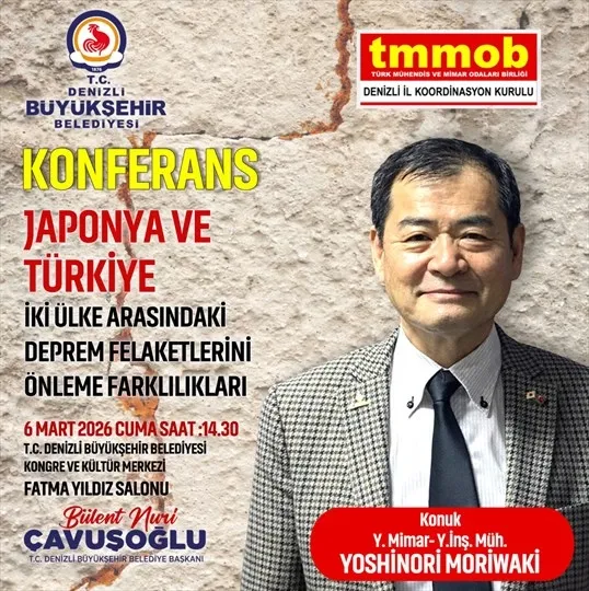 Denizli Büyükşehir Belediyesi, Türk Mühendis ve Mimar Odaları Birliği (TMMOB) Denizli İl Koordinasyon Kurulu ile iş birliği yaparak, Yüksek Mimar ve Yüksek İnşaat Mühendisi Yoshinori Moriwaki'nin konuşmacı olacağı "Japonya ve Türkiye: İki Ülke Arasındaki Deprem Felaketlerini Önleme Farklılıkları" başlıklı bir konferans düzenleyecek.