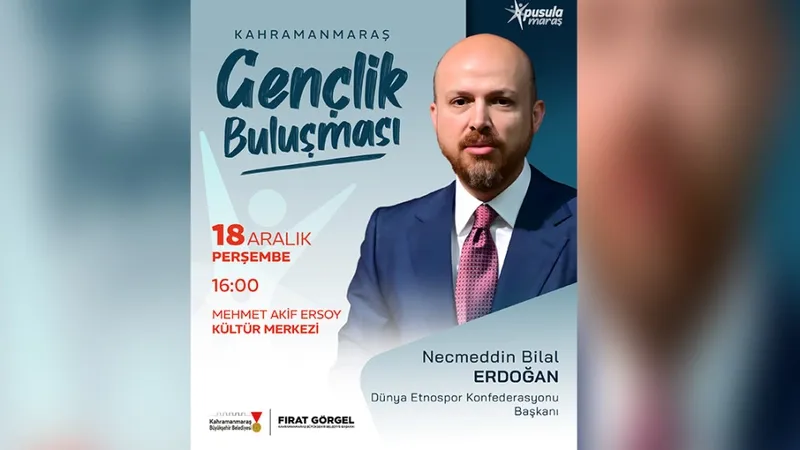 Kahramanmaraş Büyükşehir Belediyesi, 18 Aralık Perşembe günü bir Gençlik Buluşması programı düzenleyecek. Dünya Etnospor Konfederasyonu Başkanı Necmeddin Bilal Erdoğan'ın konuk olacağı etkinlik, Mehmet Akif Ersoy Kültür Merkezi'nde saat 16.00'da başlayacak. Programa tüm gençler davet edildi.