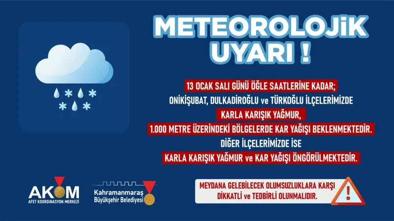 Kahramanmaraş Büyükşehir Belediyesi Afet Koordinasyon Merkezi (AKOM), şehir genelinde etkili olan yağışlı havaya ilişkin bir uyarı yayımladı. Yapılan açıklamada, mevcut olumsuz hava koşullarının 13 Ocak Salı günü öğle saatlerine kadar etkisini sürdüreceği öngörüldü.