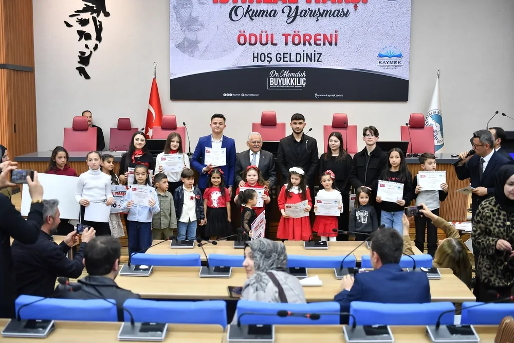 Kayseri Büyükşehir Belediyesi Kayseri Mesleki Eğitim ve Kültür A.Ş. (KAYMEK) tarafından, 12 Mart İstiklal Marşı’nın kabulünün 105’inci yılı dolayısıyla ‘İstikbal İstiklale Ses Veriyor’ İstiklal Marşı Okuma Yarışması düzenlendi. Yarışmada dereceye giren öğrencilerin ödülleri, Büyükşehir Belediye Meclis Salonu’nda düzenlenen törenle verildi.