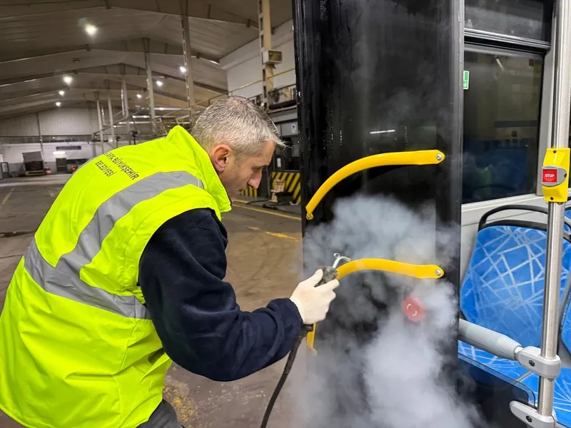 Ulaşım hizmetlerinin sabahın ilk ışıklarından gece geç saatlere kadar süren yoğun temposu, temizlik ekiplerinin gece boyunca yürüttüğü titiz dezenfeksiyon çalışmalarıyla tamamlanıyor. Şehrin dört bir yanında yolcuların temas ettiği tutacaklar, koltuklar, kapı girişleri ve tüm yüzeyler özel tekniklerle sterilize ediliyor. Dezenfeksiyonun ardından araçlar havalandırılarak iç mekân hava kalitesi artırılıyor.