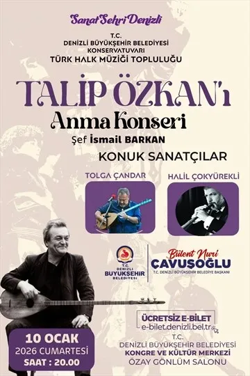 Talip Özkan'ın anısına düzenlenen konser, 10 Ocak 2026 Cumartesi günü saat 20.00'de Denizli Büyükşehir Belediyesi Kongre ve Kültür Merkezi Özay Gönlüm Salonu'nda gerçekleştirilecek. Ücretsiz olarak düzenlenecek konserin biletleri e-bilet.denizli.bel.tr adresinden temin edilebilecek.Bir Kültür Elçisinin Mirası