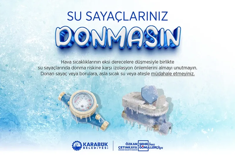Hava sıcaklıklarının sıfırın altına düşmesiyle birlikte, su sayaçlarında donma riski ortaya çıkıyor. Karabük Belediyesi, vatandaşları bu duruma karşı izolasyon önlemlerini almaya davet etti.