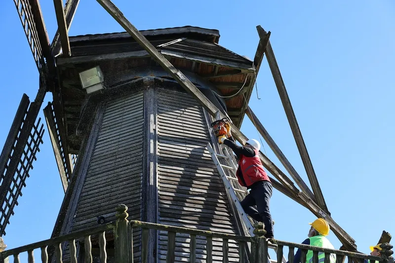 Yel Değirmeni için de restorasyon çalışmaları başlatıldı. Hassas şekilde yürütülen çalışmalarda eskiyen ahşap taşıyıcılar sökülüyor.