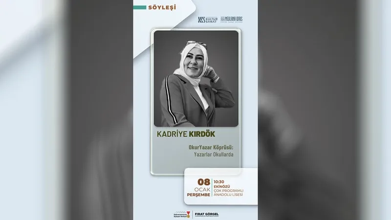 Büyükşehir Belediyesinin “Yazarlar Okullarda” programı kapsamında yazar Kadriye Kırdök, 8 Ocak Perşembe günü Ekinözü Çok Programlı Anadolu Lisesi’nde öğrencilerle buluşacak.